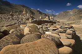 Once the capital of the ancient kingdom of Zanskar, Padum (3505 m) is the present day administrative headquarters of the region. With a population of nearly 1500, Padum can be described as the most populous settlement of Zanskar. Incidentally, it is only in Padum that there is a community of Muslims constituting nearly half of the population. Now, Padum has become famous as a major trekking base and a popular tourist destination. The nearest monument is a set of ancient rock carving on a huge boulder near the river bank, just below the old town. These date back to the 8th century and provide epigraphic evidence that the region was under the influence of North Indian Buddhism since ancient times.